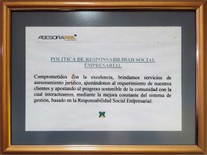 Comprometidos con la excelencia, brindamos servicios de asesoramiento jurídico, ajustándonos al requerimientos de nuestros clientes y apostando al progreso sostenible de la comunidad con la cual interactuamos, mediante la mejora constante del sistema de gestión basado en la responsabilidad social empresarial.