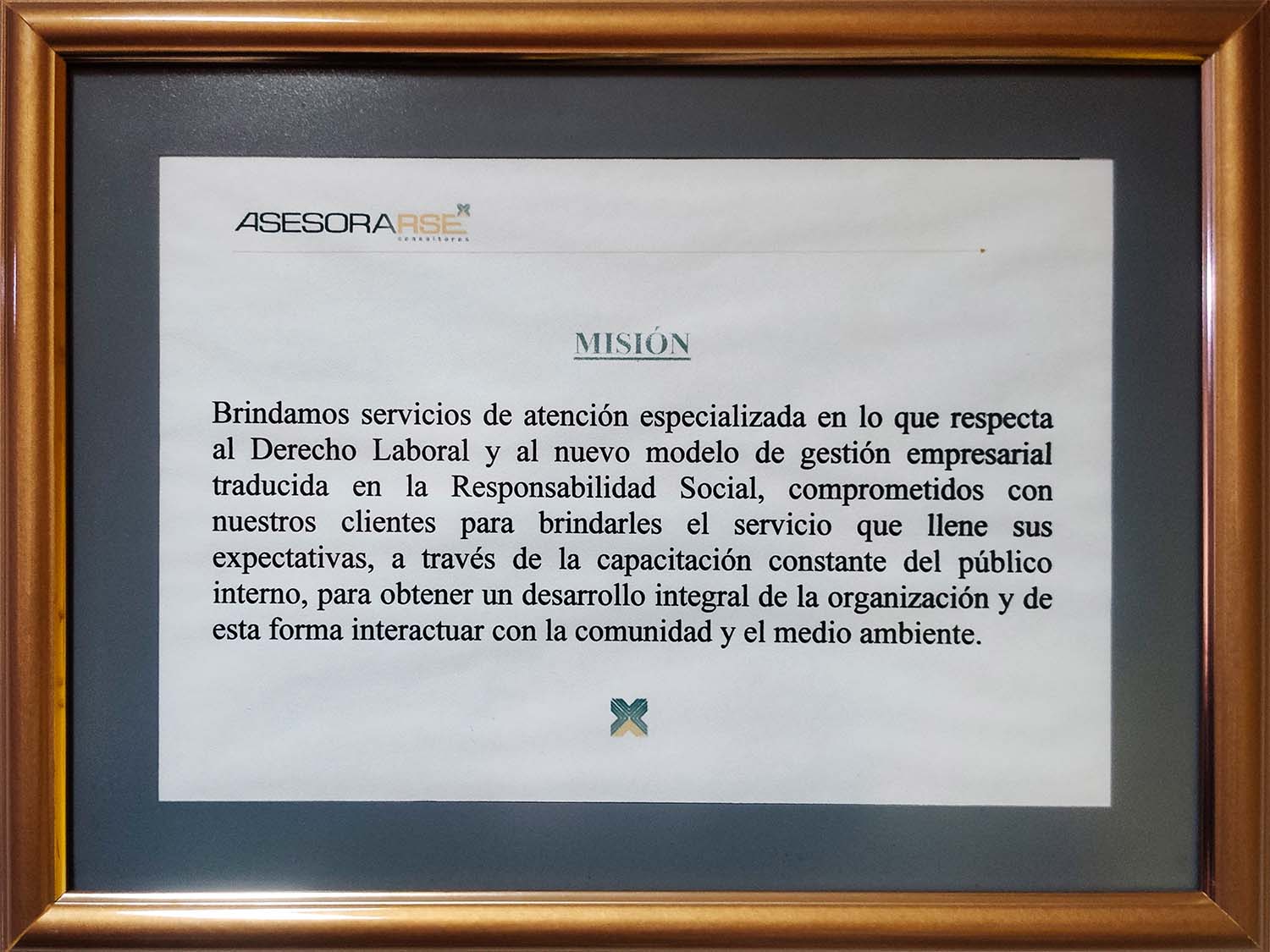 Brindamos servicios de atención especializada en lo que respecta al derecho laboral y al nuevo modelo de gestión empresarial traducida en la responsabilidad social, comprometidos con nuestros clientes para brindarles el servicio que llene sus expectativas, a través de la capacitación constante del público interno, para obtener un desarrollo integro del mismo y de esta forma interactuar con la comunidad y el medio ambiente.